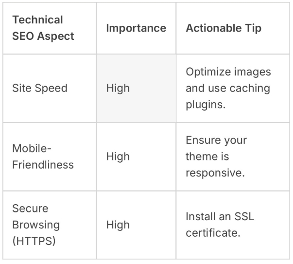 Technical SEO makes your site better for search engines ranking. Integrate your website Focusing on speed, being mobile-friendly, and being secure (HTTPS). I would advise you make good use of Google PageSpeed Insights to find ways to get better.
